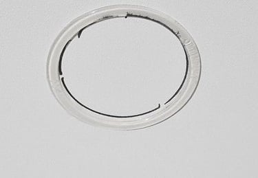 Une fois la toile tendue, il faut créer une ouverture nette à l'emplacement de chaque spot. Sur les toiles PVC, on colle une colerette de renfort : un anneau rigide qui se fixe sur la face visible de la toile avant découpe.