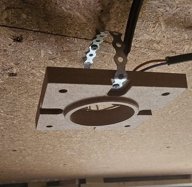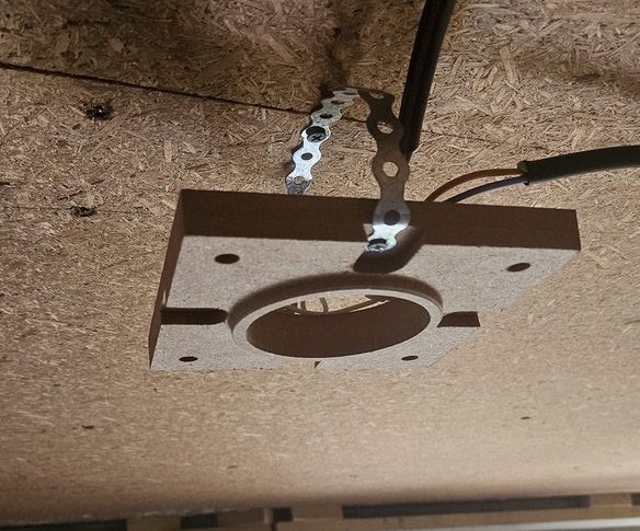 📷 Chaise de spot vissée sur le support OSB, avec câble électrique en attente — avant pose de la toile
